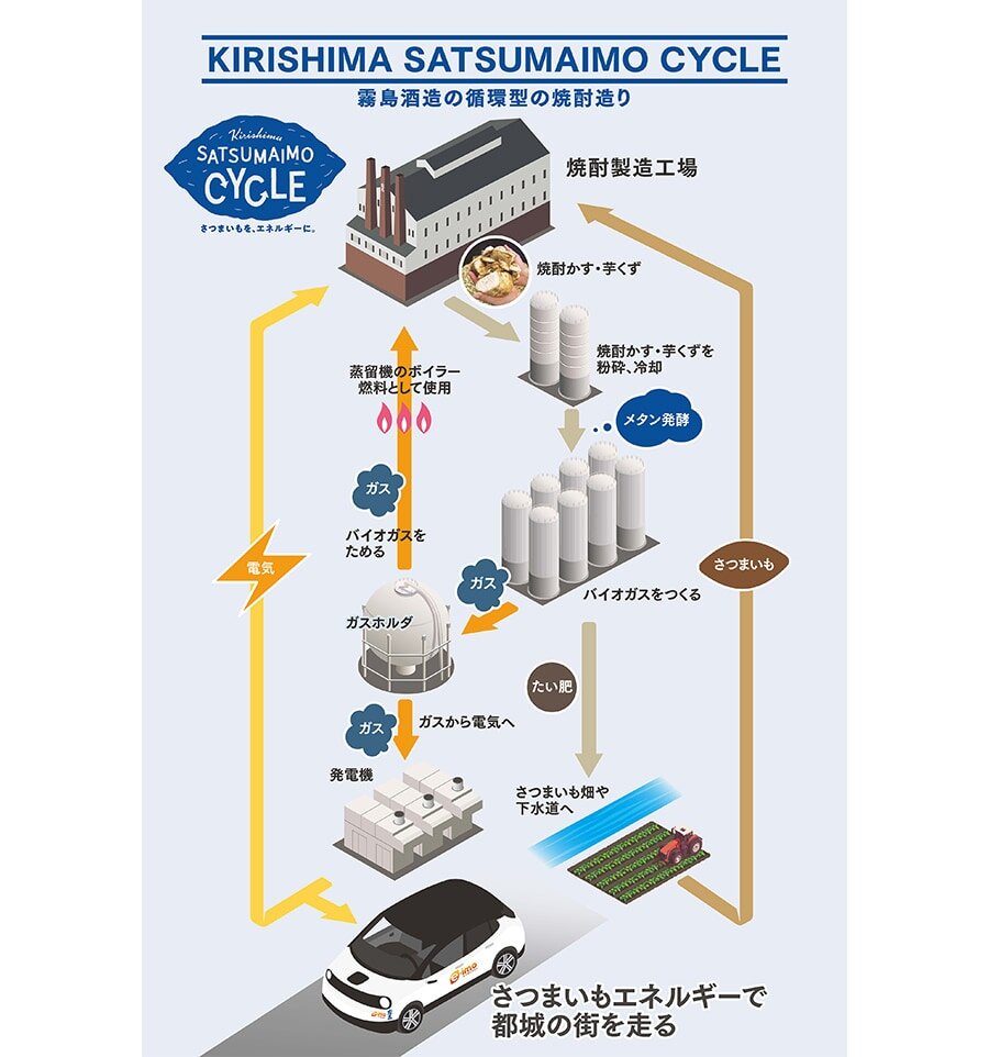 2006年に焼酎粕や芋くずなど、さつまいも由来の副産物をバイオガスに変換・リサイクルする施設を建設。2014年には「サツマイモ発電」と命名しバイオガスによる発電事業を開始するなど、本来捨てるはずのものをエネルギーとして再利用する取り組みを継続している。さらに「2030年度までの⼯場・事務所のCO2排出量実質ゼロ」を宣言し、持続可能な焼酎造りを目的とした様々な取り組みを行っている。