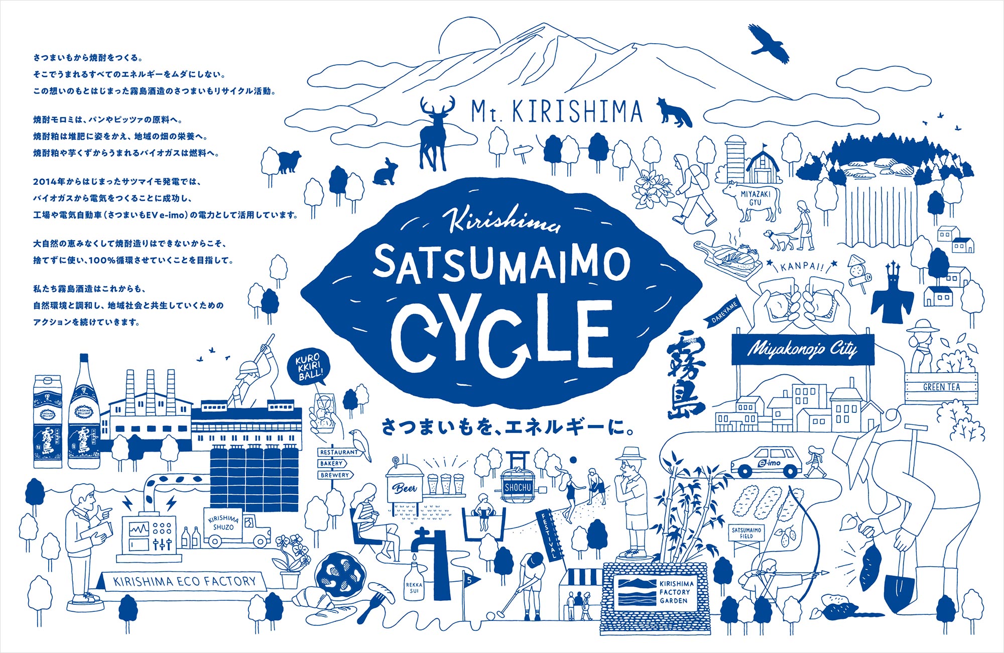 选用甘薯制作烧酒。杜绝浪费点滴能量。雾岛酒造甘薯循环计划就此启动。烧酒酿造源于大自然,目标实现100%循环利用予以回馈。雾岛酒造将不断采取行动,与自然环境和谐相处,与当地社区共存。 《KIRISHIMA SATSUMAIMO CYCLE》插图点击查看