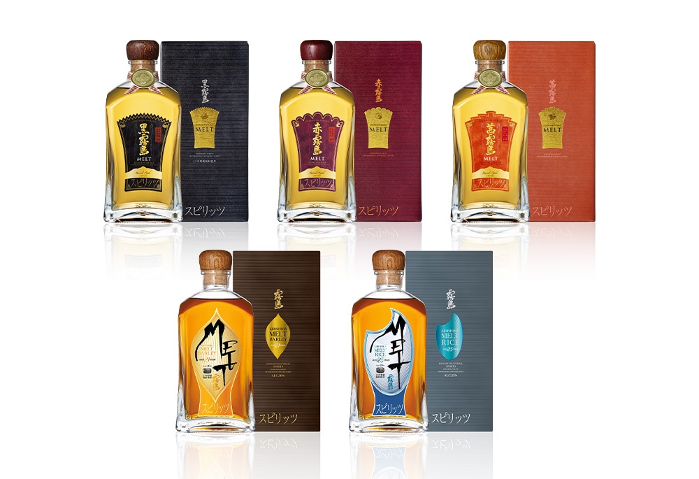 「霧島MELT」シリーズは、本格焼酎の原酒を樽での熟成も含めて長期貯蔵することで、焼酎本来の特長に加え、樽由来のまろやかでとろける味わいと琥珀色の液色を楽しめるスピリッツです。特別感のある味わいをご堪能ください。